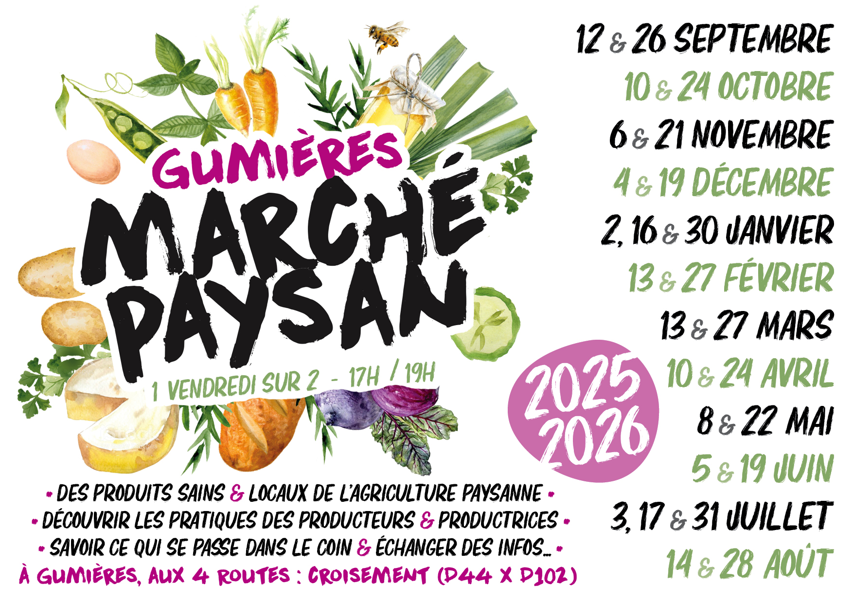 • sur le Marché paysan, aux 4 routes (Gumières), 1 vendredi sur 2, de 17h à 19h,